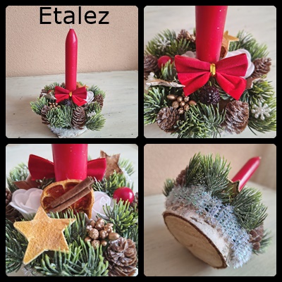 Aranjament de iarnă realizat handmade ce are la bază o felie de lemn natur pe care s-au fixat diferite accesorii (crenguțe de brad și conuri artificiale, o lumânare, steluțe din scoarță de copac și din coajă de portocală uscată, o fundiță roșie, bile colorate, baton de scorțișoară, felie de portocală uscată, flori poliuretanice, steluțe acrilice). Dacă nu aprindeți lumânarea, aranjamentul poate fi folosit mai mulți ani la rând ca decor de sărbători. Ocupă un spațiu de 14 cm lățime x 19 cm înălțime. Concept propriu, produs unicat. Preț: 60 lei