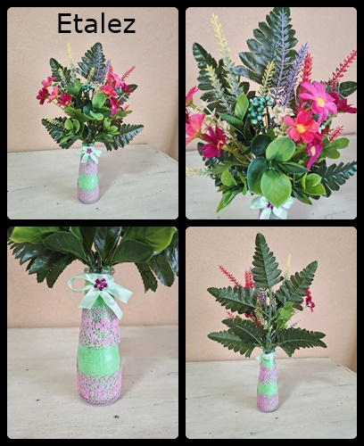 Aranjament ce are la bază o mică sticlă de 4,5 cm lățime x 13 cm înălțime ce are în ea nisip decorativ verde, flori și frunze artificiale 9sunt fixate și nu se pot scoate). Pe exterior are aplicată dantelă roz și o fundiță din satin. Ocupă un spațiu de 23 cm lățime x 36 cm înălțime. Concept propriu, produs unicat. Preț: 50 lei