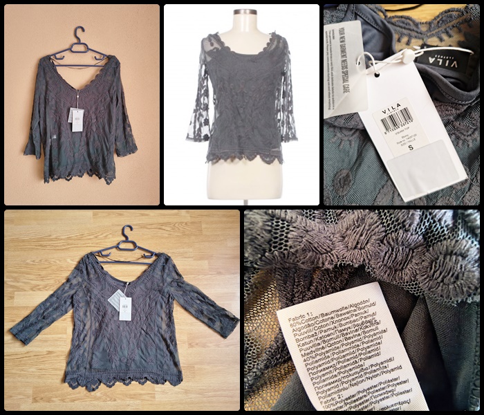 Bluză pentru femei nouă, cu eticheta din magazin. Este realizată din voal brodat de culoare gri închis. Mărimea este S, și pentru a nu fi transparentă are pe dedesubt un maiou gri cu bretele reglabile. Materialul exterior are compoziția 60% bumbac – 40%polyamida, iar cel interior este 100% polyester. Dimensiuni aproximative: 43 cm lățime = 86 cm diametru x 57 cm lungime x 43 cm lungime mâneci (trei sferturi). Calitatea este una superioară, firma producătoare fiind Vila din Danemarca. Preț: 55 lei