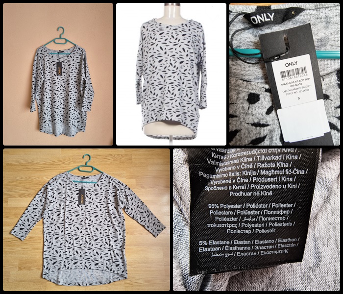 Bluzaă femei nouă, cu eticheta din magazin. Mărimea este S, iar materialul este 95% polyester – 5% elastane. Croiala este largă astfel încât se va potrivi și mărimii M. Este potrivită pentru primăvară – toamnă. Dimensiuni aproximative: 54 cm lățime = 108 cm diametru x 70 cm lungime x 41 cm lungime mâneci (trei sferturi). Calitatea este una superioară, firma producătoare fiind Only din Danemarca. Preț: 50 lei