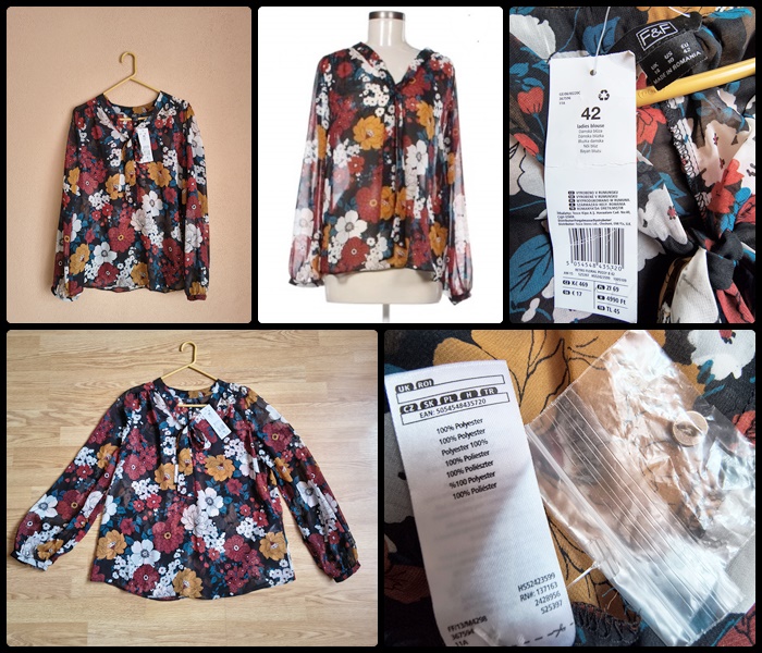 Bluză nouă, cu eticheta originală din magazin. Este realizată din material ce are compoziția 100% polyester și este semitransparent. Mărimea este L/42, dar le va veni si celor cu M datorită croielii vaporoase. Dimensiuni aproximative: 56 cm lățime = 112 cm circumferință x 65 cm lungime x 61 cm lungime mânecă. Calitatea este una superioară, firma producătoare fiind F&F din UK. Preț: 50 lei