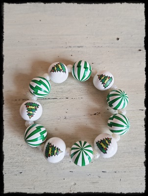 Brățară realizată handmade din mărgele din lemn imprimate cu motive de iarnă. Este elastică și are diametrul de 19 cm. Preț: 25 lei