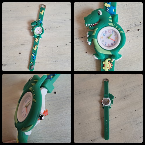 Ceas nou pentru copii cu curea din silicon verde și imprimeu cu dinozauri. Dimensiuni aproximative: diametru cadran 3,3 cm x lungime curea reglabilă 14 – 19 cm (lungime totală 21 cm) x lățime curea 1,4 cm. Vine cu baterie inclusă. A fost verificat și este perfect funcțional. La cheița de reglare a orei are un mic opritor care este pus pentru a nu se consuma bateria, el va fi scos înainte de a purta ceasul. Vine în ambalaj simplu (punguță transparentă). Preț: 45 lei