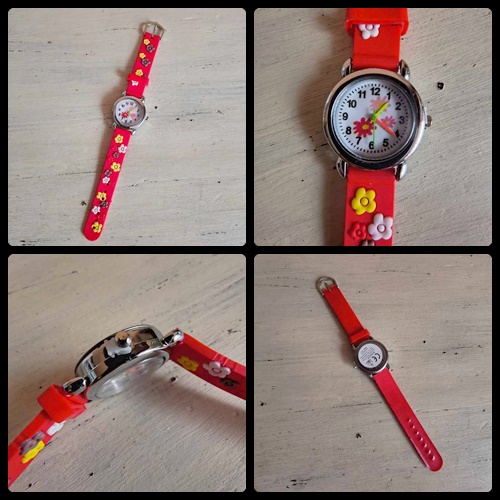 Ceas nou pentru copii cu curea din silicon roșie și imprimeu floral. Dimensiuni aproximative: diametru cadran 2,8 cm x lungime curea reglabilă 14,5 – 18,5 cm (lungime totală 19,5 cm) x lățime curea 1,5 cm. Vine cu baterie inclusă. A fost verificat și este perfect funcțional. La cheița de reglare a orei are un mic opritor care este pus pentru a nu se consuma bateria, el va fi scos înainte de a purta ceasul. Preț: 45 lei