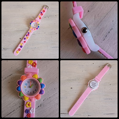 Ceas nou pentru copii cu curea din silicon roz și imprimeu floral. Dimensiuni aproximative: diametru cadran 3,2 cm x lungime curea reglabilă 14 – 18 cm (lungime totală 19,3 cm) x lățime curea 1,5 cm. Vine cu baterie inclusă. A fost verificat și este perfect funcțional. La cheița de reglare a orei are un mic opritor care este pus pentru a nu se consuma bateria, el va fi scos înainte de a purta ceasul. Va veni într-un ambalaj simpu, adică o punguță transparentă. Preț: 50 lei