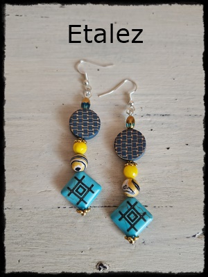 Cercei realizați handmade din pietre semiprețioase (calcedonie, malachit, turcoaz imprimat cu model), mărgeluțe din sticlă, mărgele aplatizate din lemn cu model imprimat și elemente metalice. Dimensiuni aproximative: 1,8 cm lățime x 6,5 cm lungime. Concept propriu, produs unicat. Preț: 35 lei