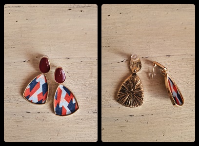 Cercei realizați din charmuri metalice aurii și elemente acriloce multicolore. Dimensiuni aproximative: 1,9 cm lățime x 4 cm lungime. Preț: 25 lei