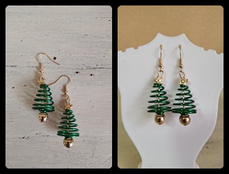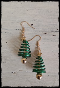 Cercei metalici aurii și verzi în formă de brăduți. Dimensiuni aproximative: 1,8 cm lățime x 3,5 cm lungime. Preț: 25 lei