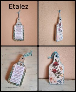 Decorațiune realizată handmade pe un suport (fund/tocător) din lemn nou (cumpărat special pentru a fi transformat în obiect decorativ). Este decorat pe ambele fețe și e dat cu lac incolor pentru protecție. Pe o parte are un model floral, iar pe cealaltă parte are Binecuvântarea Casei. Se poate folosi ca decorațiune în bucătărie, pe terasă, în balcon, în zona de dining sau în orice altă încăpere. Se poate agăța într-un cui, pe o suprafață plană verticală prin sfoara atașată la capătul lui sau direct prin orificiul/gaura din coadă. Se va evita expunerea lui la abur, umezeală, stropi de ulei. Nu se va spăla, doar se va șterge ocazional de praf cu o cârpă moale și uscată. Nu se va folosi nimic abraziv pentru a zgâria/strica modelul. Dimensiuni aproximative: 10,6 cm lățime x 22,2 cm lungime (cu tot cu coadă/mâner – 29 cm cu tot cu șnurul de agățare) x 1,6 cm grosime. Concept propriu, produs unicat. Preț: 75 lei