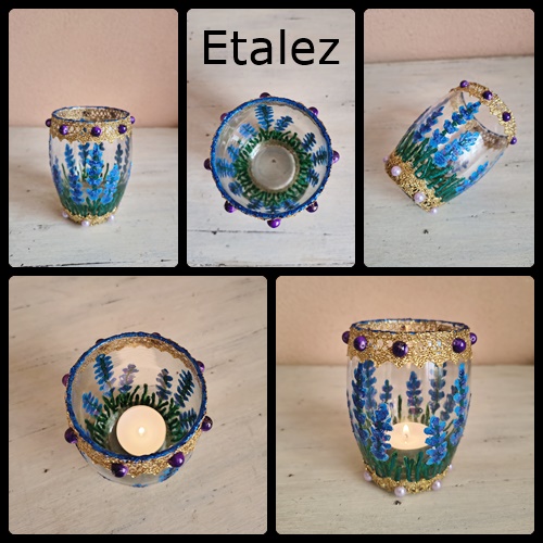 Recipient din sticlă pictat manual cu mici flori de lavandă și cu dantelă aurie și mărgele atașate. Se poate folosi ca suport pentru lumânare (pastilă sau tubulară), ori se pot ține în el diferite obiecte: creioane, carioci, pensule, bijuterii, suveniruri, dulciuri mici ambalate, pliculețe cu ceai sau chiar flori. Este indicat să fie ferit de umezeală și să fie șters doar cu o cârpă moale uscată. Nu se va curăța cu nimic abraziv care să zgârie suprafața pictată. Dimensiuni aproximative: 6 cm diametru inferior x 7 cm diametru superior x 10,7 cm înălțime. Concept propriu, produs unicat. Preț: 75 lei
