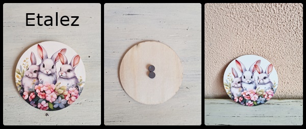 Decorațiune realizată din lemn. Are magnet pe spate pentru a putea fi pusă pe orice suprafață metalică, sau se poate sprijini de o suprafață plană mobilier/perete. Dimensiuni aproximative: 10 cm diametru x 2,5 mm grosime. Preț: 25 lei