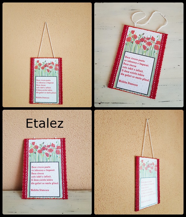 Decorațiune handmade care reprezintă un imprimeu cu maci stilizat și un citat din Nichita Stănescu: ”Dacă cineva poate să iubească, e împărat; dacă cineva este iubit, e infinit. Și dacă există iubire, din goluri se naște plinul.” Este lăcuită pentru o mai bună rezistență în timp. Se poate agăța pe un perete, o ușă, orice piesă de mobilier sau se poate așeza sprijinită de o suprafață verticală. Dimensiuni aproximative: 13 cm lățime x 33 cm lungime (cu tot cu șnurul de agățare). Concept propriu, produs unicat. Preț: 45 lei