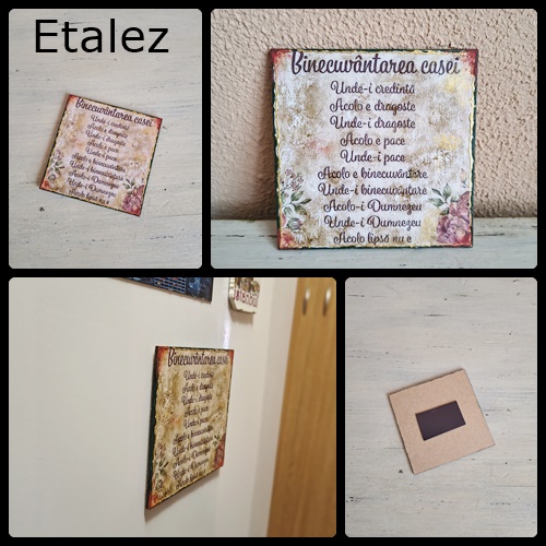 Decorațiune care are rol de magnet pentru orice suprafață metalică, dar care se poate sprijini și de un perete/obiect/piesă mobilier. Este realizată handmade și este dată cu lac incolor pentru protecție. Are aspect vintage/învechit, iar ca text are Binecuvântarea Casei. Dimensiuni aproximative: 9,5 cm lățime x 9,5 cm înălțime. Concept propriu, produs unicat. Preț: 40 lei