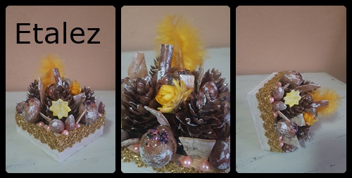 Decorațiune realizată handmade ce are la bază un suport din lemn în care s-au atașat materiale naturale: conuri de brad uscate, scoarță de copac uscată, alune, nuci, scorțișoară, flori uscate și dantelă aurie, mărgele tip perlă, cristale din sticlă colorate și puțin glitter. Dimensiuni aproximative: 14 cm lățime x 14 cm lungime x 13 cm înălțime. Concept propriu, produs unicat. Preț: 55 lei