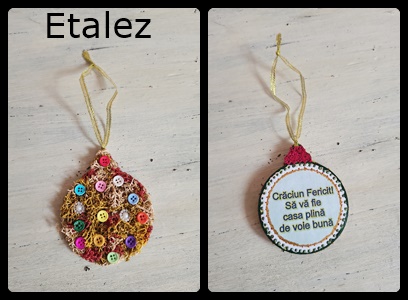 Decorațiune realizată handmade în formă de glob cu două fețe: pe o parte are o urare de Crăciun, iar pe cealaltă are licheni stabilizați și mici nasturi acrilici ca globulețe. Dimensiuni aproximative: 7,5 cm lățime x 9 cm înălțime (19 cm cu șnurul de agățare). Concept propriu, produs unicat. Preț: 45 lei