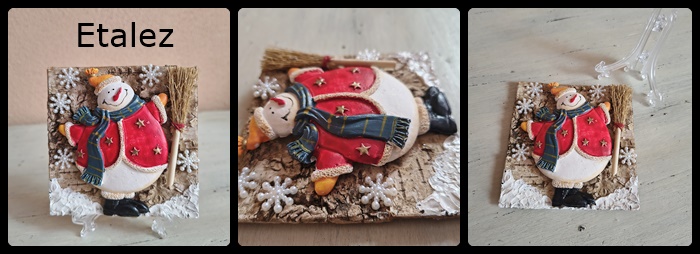 Decorațiune realizată handmade cu motive de iarnă. Modelul este în relief/3D (om de zăpadă ceramic, mătură, fulgi de nea, zăpadă) și este montat pe o bucată de scoarță de copac naturală. Are un suport acrilic transparent pe care se va așeza ca un mini tablou. Dimensiuni aproximative: 9,5 cm lățime x 12 cm înălțime (cu tot cu suport). Concept propriu, produs unicat.