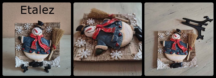 Decorațiune realizată handmade cu motive de iarnă. Modelul este în relief/3D (om de zăpadă ceramic, mătură, fulgi de nea, zăpadă) și este montat pe o bucată de scoarță de copac naturală. Are un suport acrilic negru pe care se va așeza ca un mini tablou. Dimensiuni aproximative: 9,5 cm lățime x 12 cm înălțime (cu tot cu suport). Concept propriu, produs unicat. Preț: 55 lei