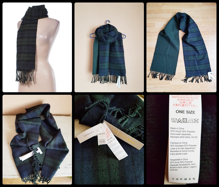 Fular bărbați nou, cu eticheta din magazin. Compoziție: 50% polyester – 50% acrylic. Culoare: negru, verde, bleumarin (pe o parte) – verde pe cealaltă parte. Dimensiuni: 30,5 cm lățime x 190 cm lungime. Calitatea este una superioară, firma producătoare fiind Topshop (aparține de Asos din UK/Marea Britanie). Preț: 40 lei