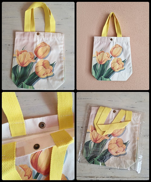 Gentuță de mărime medie din pânză rezistentă și cu imprimeu floral (lalele). Poate fi oferit cu orice ocazie (1 sau 8 martie, paște, aniversare, onomastică). Închiderea se face în două capse. Dimensiuni aproximative: 23 cm lățime x 36 cm lungime (cu tot cu torțile care au 2,5 cm lățime). Preț: 45 lei