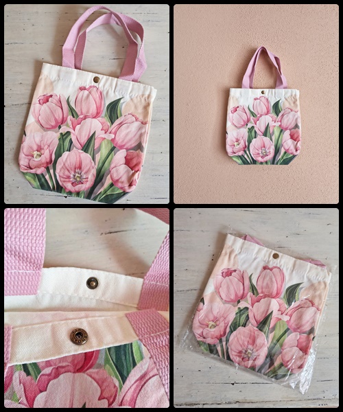 Gentuță de mărime medie din pânză rezistentă și cu imprimeu floral (lalele). Poate fi oferit cu orice ocazie (1 sau 8 martie, paște, aniversare, onomastică). Închiderea se face în două capse. Dimensiuni aproximative: 23 cm lățime x 36 cm lungime (cu tot cu torțile care au 2,5 cm lățime). Preț: 45 lei