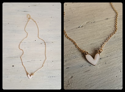 Lănțișor auriu cu medalion emailat în formă de inimă. Dimensiuni aproximative: 1 cm x 1 cm medalion, lungime reglabilă lănțișor: 44 – 50 cm. Preț: 25 lei