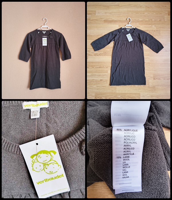 Rochie fete nouă, cu eticheta din magazin. Mărimea este 126 (7/8 ani). Culoarea este negru, iar materialul are în compoziție 85% acrylic și 15% lână. Este potrivită pentru primăvară și toamnă. Dimensiuni aproximative: 36 cm lățime talie = 72 cm diametru x 66 cm lungime x 30 cm lungime mânecă. Calitatea este una superioară firma producătoare fiind Vertbaudet din Franța. Preț: 45 lei