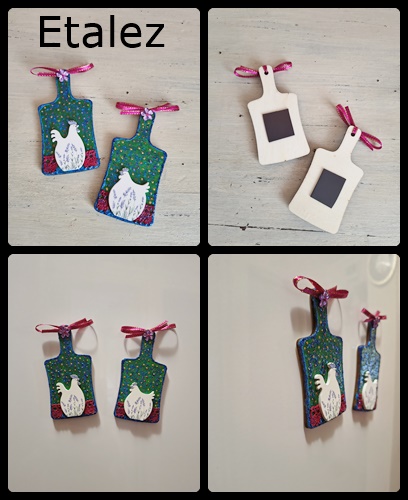 Set de magneți pentru frigider (sau orice suprafață metalică din bucătărie) realizat handmade. Sunt în formă de mici tocătoare și au fixate figurine cu o găină și un cocoș. Materialele folosite sunt lemn și dantelă. Dimensiuni aproximative: 5 cm lățime x 9,5 cm înălțime X 2 bucăți. Concept propriu, set unicat. Preț: 45 lei