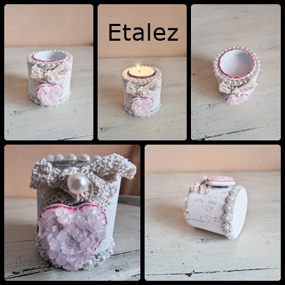 Suport din lemn decorat handmade cu ștrasuri tip perlă sidefate, dantelă și pietre semiprețioase naturale quarț roz. Este potrivit pentru lumânări tip pastilă. Dimensiuni aproximative: 6 cm diametru total x 6 cm lățime x 3,8 cm diametru lumânare. Concept propriu, produs unicat.
