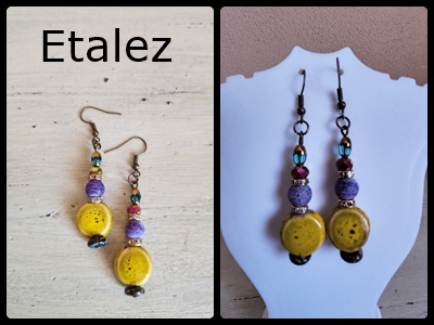 Cercei realizați handmade din pietre semiprețioase (agate naturale frosted), cristale din sticlă fațetate, mărgele aplatizate ceramice cu aspect vintage și elemente metalice. Dimensiuni aproximative: 1,4 cm lățime x 4,9 cm lungime. Concept propriu, produs unicat. Preț: 35 lei