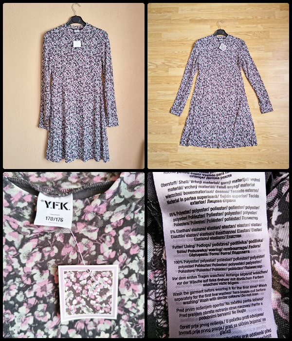 Rochie fete nouă, cu eticheta din magazin. Mărimea este 170/176 (14/15 ani). Materialul este 100% polyester. Nu este transparentă pentru că are dublură pe interior, iar imprimeul este floral. Este potrivită pentru primăvară, vară și toamnă. Dimensiuni aproximative: 36 cm lățime talie = 72 cm diametru x 89 cm lungime x 63 cm lungime mânecă. Calitatea este una superioară firma producătoare fiind Y.F.K. din SUA. Preț: 55 lei