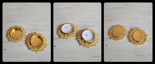 Set suporturi lumânări pastilă format din două bucăți. Sunt metalice, aurii și au ștrasuri pe margini. Dimensiuni aproximative: 7,1 cm diametru total (3,7 cm diametru disponibil pentru lumânarea pastilă) x 1 cm înălțime. Preț set: 45 lei